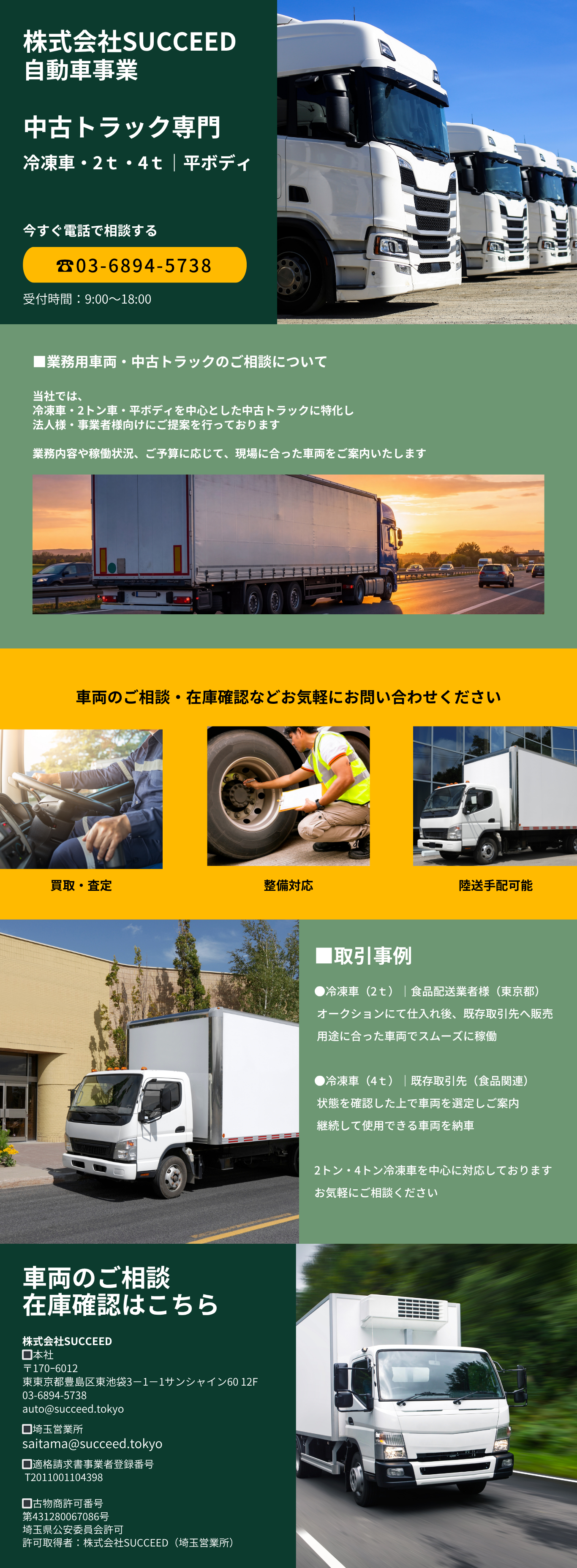 株式会社SUCCEEDは、中古トラック(冷凍車・2トン・4トン)を中心とした自動車事業と、心と暮らしを整える教育事業を展開しています。法人・事業者様向けの車両提案と、女性向けの学び・コミュニティ運営を行っています。
